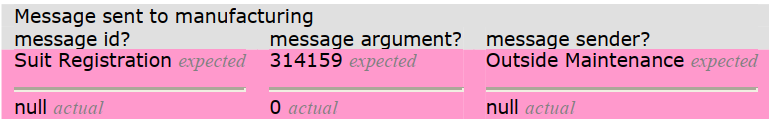 Chúng tôi ngồi tại khu làm việc của chúng tôi và Jerry chạy kiểm thử chấp nhận RegisterNormalSuit. Hai bảng đầu tiên không có gặp lỗi, nhưng cái thứ ba lại trông như thế này: