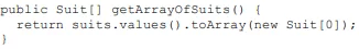 “Ừ! Và giờ ta có thể bỏ được cái hàm ép kiểu xấu xí trong getArrayOfSuits.” Avery lấy bàn phím và xóa phần ép kiểu.