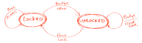 “Ừ, ừ, tôi biết.” Jasmine gắt gỏng ngắt lời, “nhưng tôi không có đủ diện tích tường cũng như là thời gian để hoàn thành FSM.” “Hãy kiên nhẫn giúp tôi. Hệ thống đơn giản hóa này bắt đầu ở trạng thái ĐÃ KHÓA. Nếu bạn đưa ra một dấu hiệu hợp lệ tại đó, cổng sẽ mở và FSM đi vào trạng thái MỞ KHÓA. Một khi bạn đã qua được cổng, nó sẽ tự động đóng và khóa lại, và FSM trở lại trạng thái ĐÃ KHÓA.”