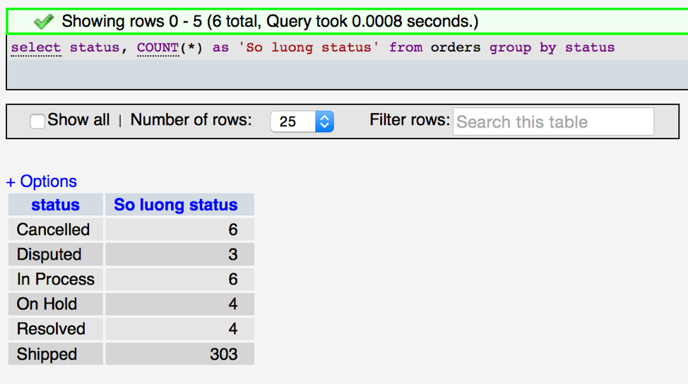 Để giải quyết vấn đề trên chúng ta sử dụng mệnh đề group by với cột status như sau: