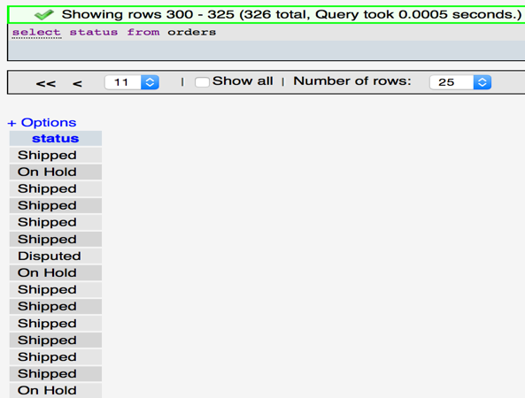 Sử dụng câu lệnh select status from orders thì sẽ trả về toàn bộ số bản ghi trong bảng đơn hàng, kể cả những bản ghi có trạng thái trùng nhau, tức là kết quả trả về như hình dưới, chúng ta sẽ không thể thực hiện việc đếm hay tự lọc bằng mắt để lấy về các trạng thái của đơn hàng vì số lượng bản ghi trả về rất nhiều.