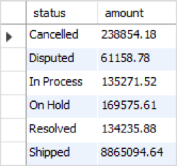 select status, sum(quantityOrdered * priceEach) as amount from orders inner join orderdetails on orders.ordernumber = orderdetails.ordernumber group by status