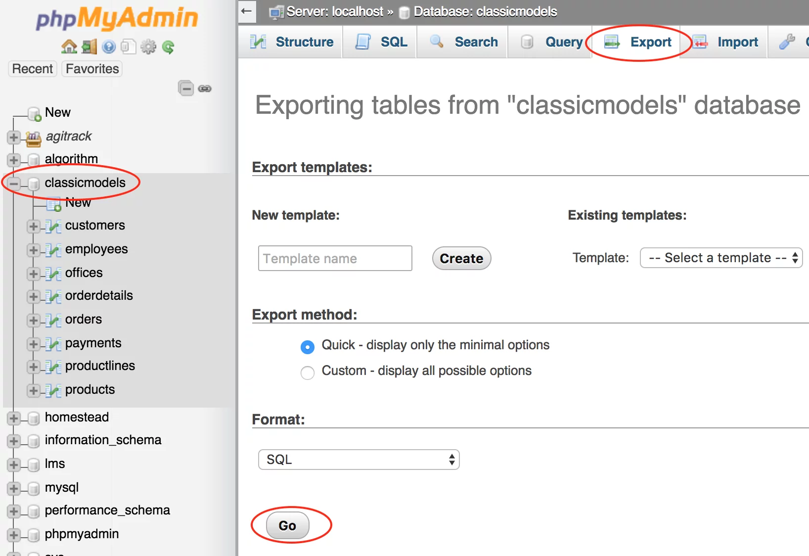 4. Nhấn nút “Go” để xuất và tải về file .sql.