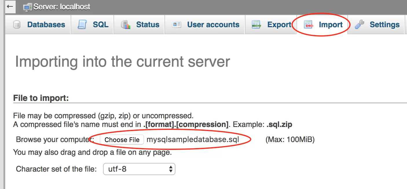 3. Chọn file muốn nhập, trong trường hợp này chúng ta chọn file mysqlsampledatabase.sql