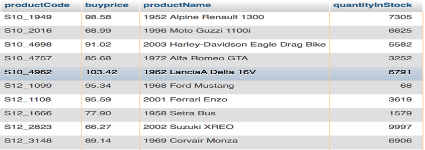 select productCode, productName, buyprice, quantityInStock from products where buyprice > 56.76 and quantityInStock > 10