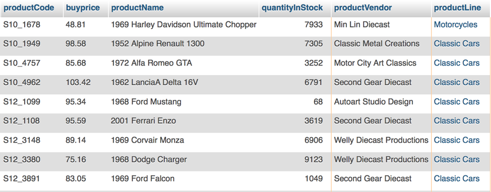 Bây giờ nếu muốn hiển thị ra các sản phẩm có loại sản phẩm là Classic Cars hoặc nhà cung cấp là ‘Min Lin Diecast’ sử dụng truy vấn như sau: