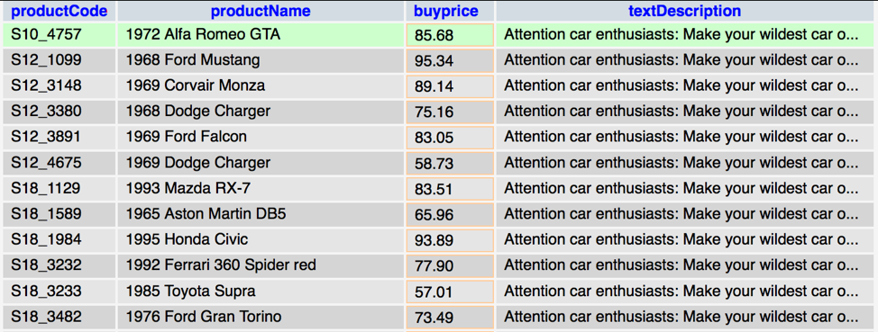 Bây giờ, nếu bạn muốn lấy productcode, productname và buyprice từ bảng products, textdescription từ bảng productlines với điều kiện giá mua nằm trong khoảng từ 56.76 đến 95.59. Bạn cần chọn dữ liệu từ cả hai bảng và đối chiếu các hàng bằng cách so sánh cột productline từ bảng sản phẩm với cột productline từ bảng productlines dưới dạng truy vấn sau:
