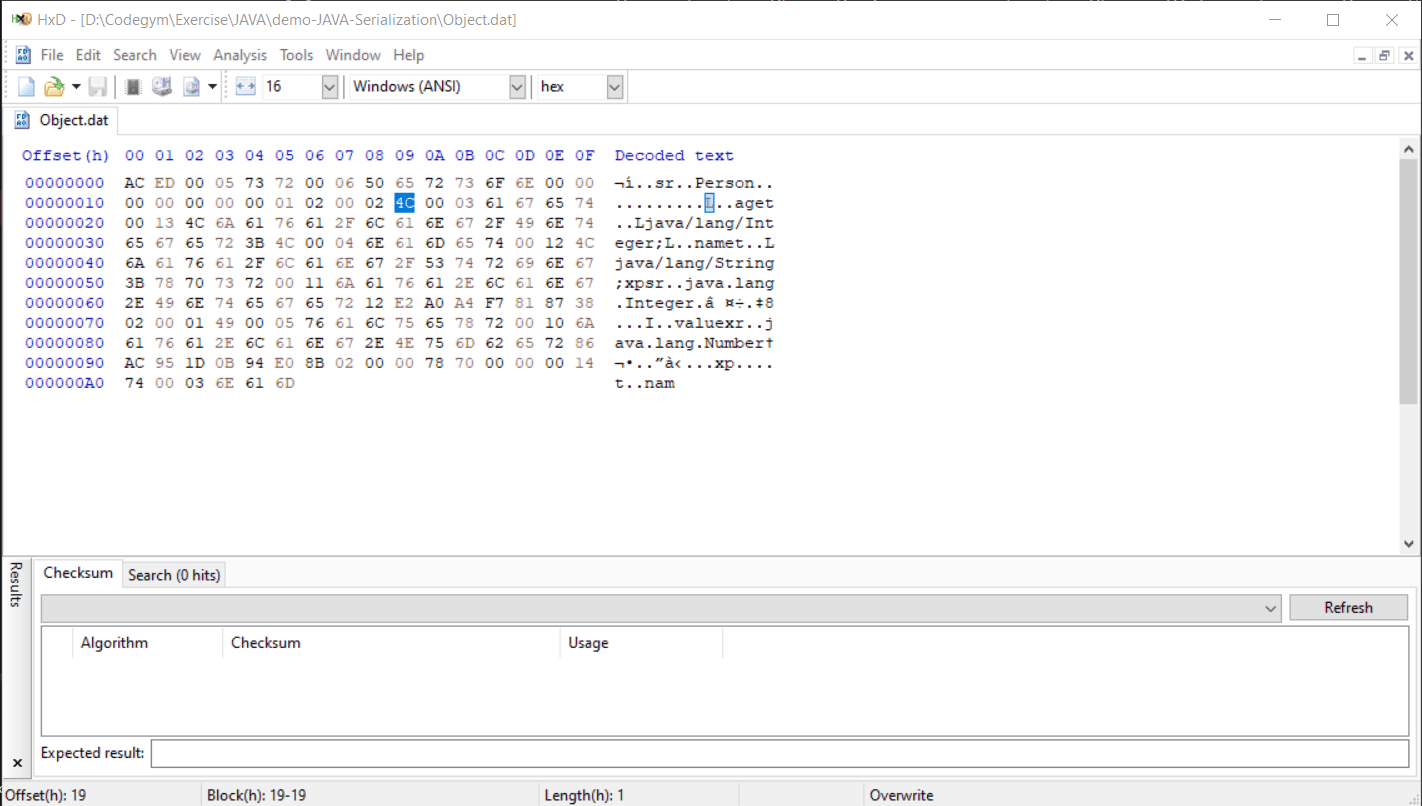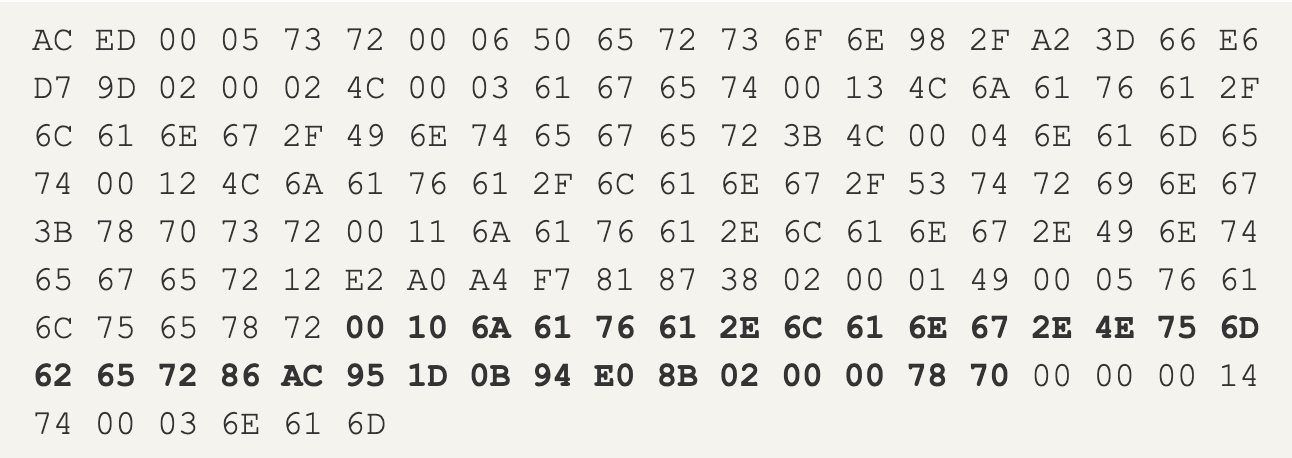 - 98 2F A2 3D 66 E6 D7 9D: SerialVersionUID. Serial Identifier của class. Giá trị này dùng để đánh giá object trong File nhị phân có đúng với object của class đó không.Khi deserialize sẽ được chuyển về kiểu dữ liệu Long và được so sánh bằng với giá trị được khai báo trong class. Nếu không khai báo, thuật toán sẽ tự gán một giá trị mặc định cho File nhị phân. Do đó, nếu class bị chỉnh sửa, giá trị mặc định này sẽ thay đổi ở phía class.
