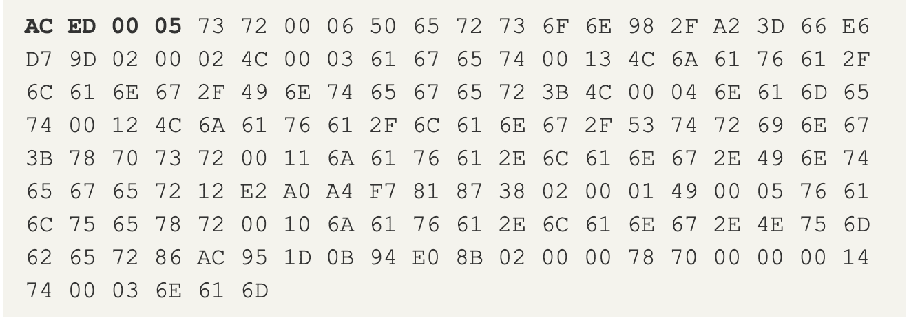 - AC ED: STREAM_MAGIC. Chỉ ra rằng đây là một giao thức số hoá. Tất cả các File Object sẽ bắt đầu với giá trị này và nó LUÔN được viết ở vị trí đầu tiên của chuỗi. Có thể thấy giá trị này gần giống với File Signature. Ví dụ File JPEG luôn bắt đầu với chuỗi FF D8 FF DB hoặc FF D8 FF EE.