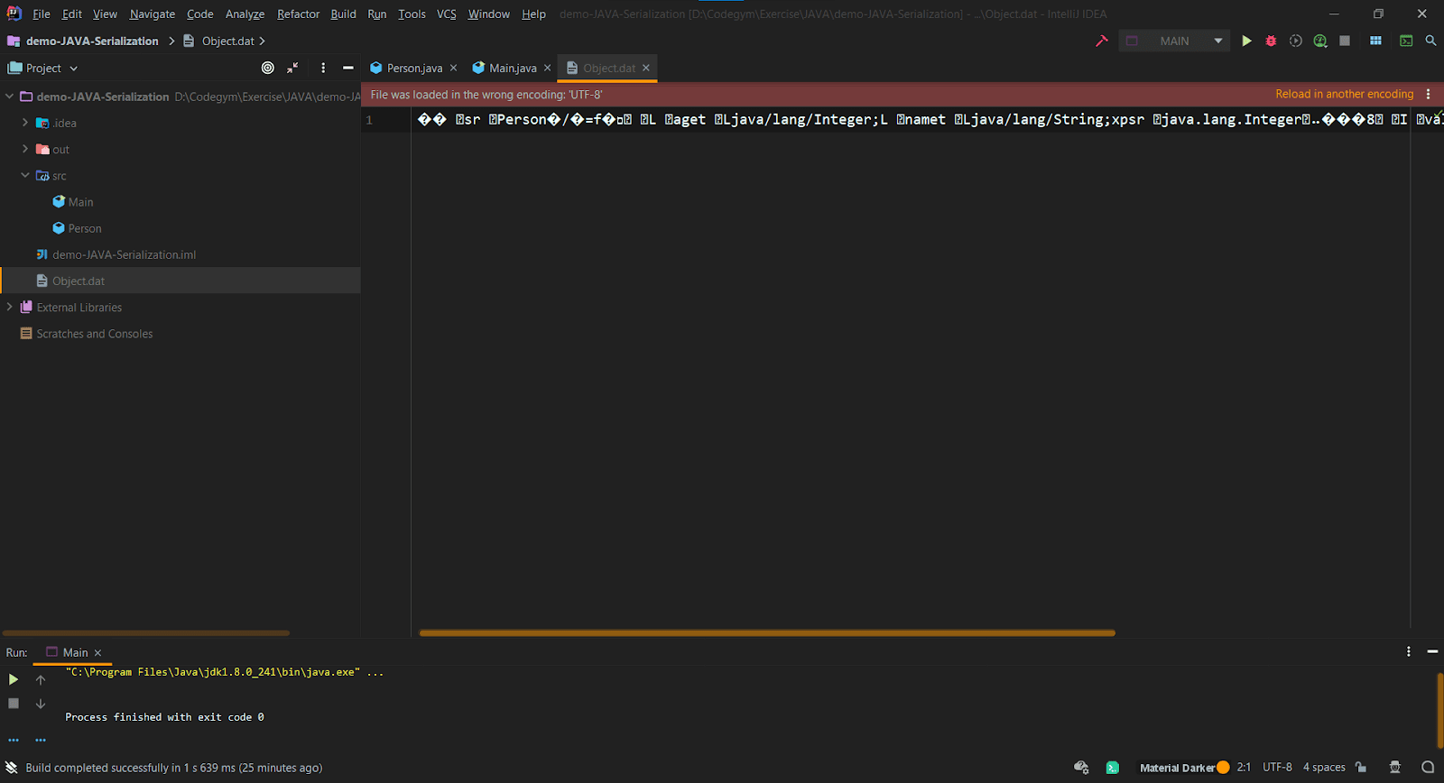 Trong đoạn code dưới đây, mình tạo một class Person chứa 2 thuộc tính name và age. Class Person triển khai interface Serializable để cho phép số hoá các object của class Person. Trong hàm main, mình tạo Object person của class Person và truyền vào nó 2 giá trị nam và 20 tương ứng cho tên và tuổi. Sau đó mình dùng ObjectOutputStream để lưu trữ trạng thái của Object person thành File nhị phân có tên là Object.dat.