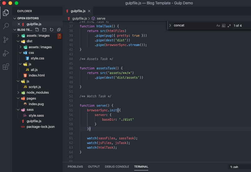 Bây giờ các module đã được cài đặt, chúng ta bắt tay vào cấu hình các task. Mở file gulpfile.js, đầu tiên chúng ta sẽ khai báo các module được sử dụng: