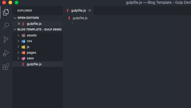 Trước tiên, chúng ta cần tạo 1 file có tên là gulpfile.js, các cấu hình task sẽ được lưu trong file này. Tạo tiếp các thư mục css, js, assets, pages, sass, chúng ta sẽ có cấu trúc cây thư mục như sau: