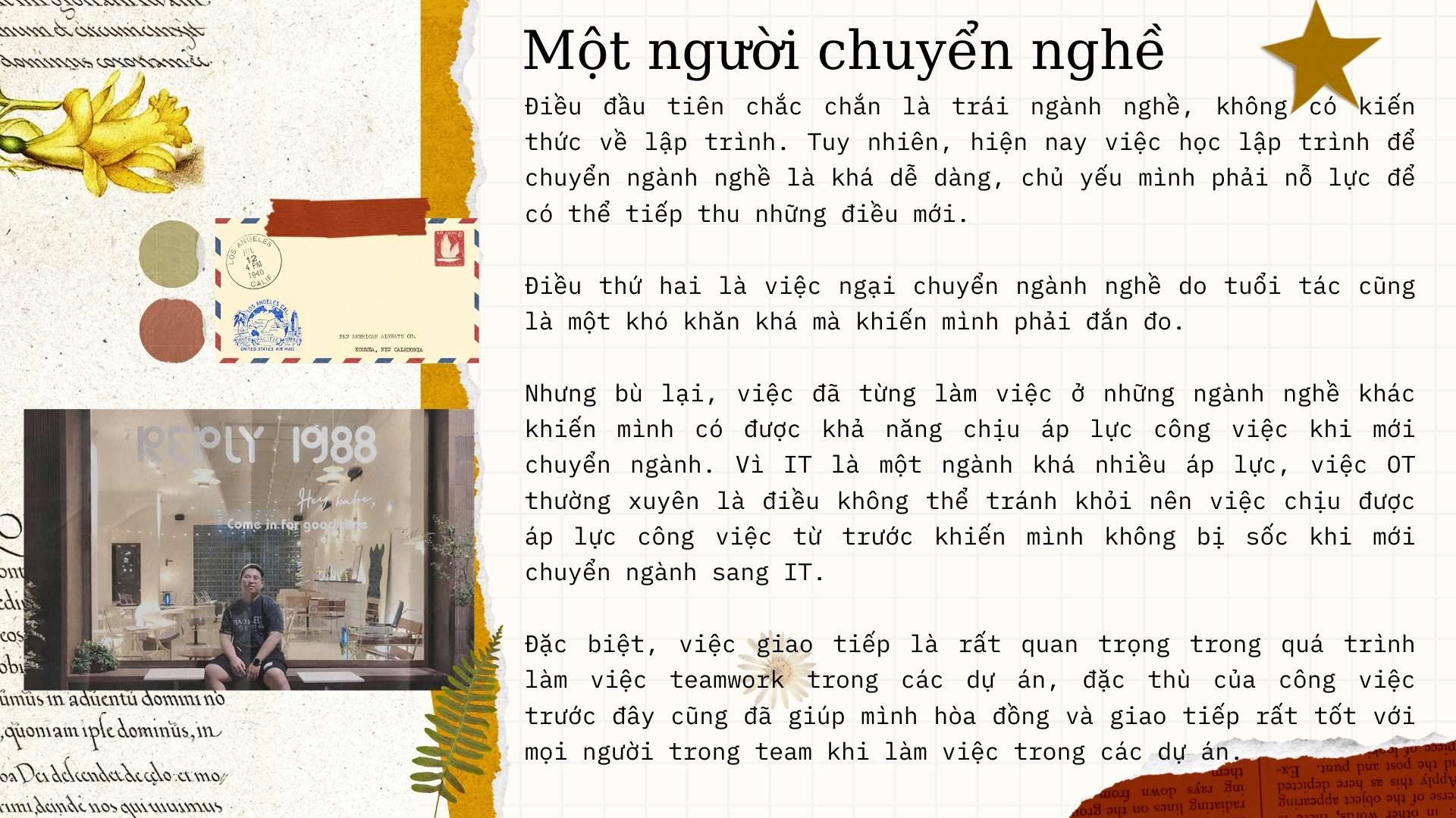 Trước khi quyết định chuyển sang ngành lập trình, mình đã từng đi học và làm việc ở lĩnh vực du lịch. Tuy nhiên, do ảnh hưởng của đại dịch Covid-19 khiến cơ hội làm việc bị hạn chế nên mình quyết định tìm kiếm cho bản thân một hướng đi khác. Cảm thấy mình có năng khiếu trong ngành công nghệ thông tin, mình đã lựa chọn theo đuổi niềm đam mê thứ hai của mình sau kinh doanh, đó là lý do vì sao mình lại chọn ngành lập trình là bước đi tiếp theo của mình.