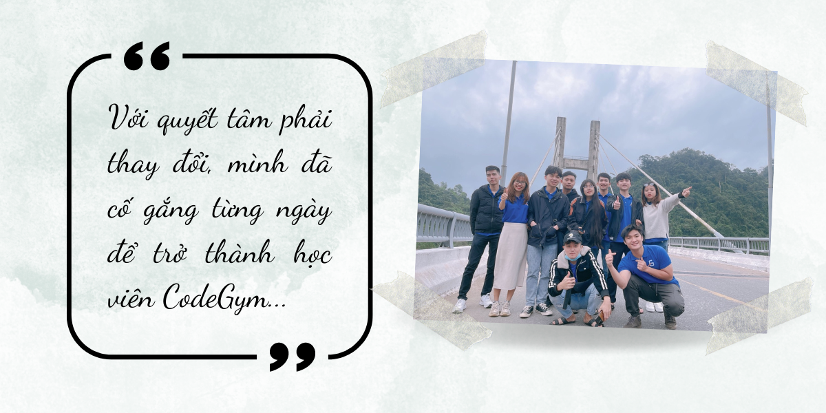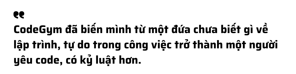 Không ai tin mình sẽ nghiêm túc học tập để thay đổi, mọi người trong nhà chưa bao giờ nghĩ đến việc sẽ có ngày mình được ngồi trong văn phòng với điều hòa mát lạnh, làm một công việc liên quan đến trí óc thay vì dãi nắng dầm mưa chân tay lấm lem dầu nhớt. Khoảng thời gian đó mình khá stress nhưng rất may CodeGym luôn đồng hành cùng mình, động viên mình để mình tiếp tục kiên trì. Cuối cùng thì mình cũng đã thành công nhập học lớp C0821H1 của CodeGym Quảng Trị.