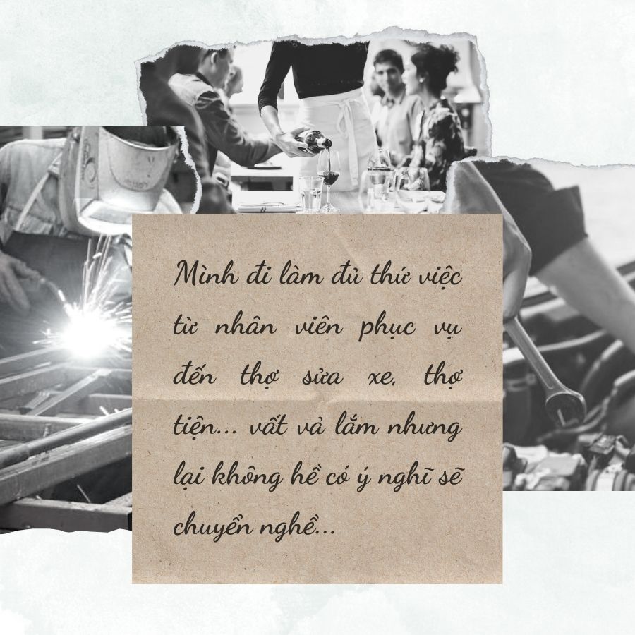 Trước đây vì một vài lí do mà sau khi tốt nghiệp THPT mình không học Đại học mà chuyển sang đi làm kiếm tiền luôn. Mình bắt đầu với nghề phục vụ tại một nhà hàng ở Đà Nẵng, sau đó vì dịch Covid nên mình lại trở về quê. Ở quê mình đã làm đủ thứ việc như là sửa xe cho gara, làm thợ tiện,… công việc không khó nhưng vất vả lắm, suốt ngày tay chân quần áo dính nhớt dầu nhưng mình lại không hề có ý nghĩ sẽ chuyển nghề lúc đó. Mình thấy cứ làm công việc như vậy cũng ổn thôi, thoải mái tự do mà không phải lo nghĩ nhiều.