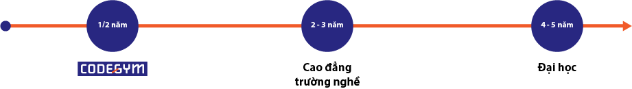 Nhờ áp dụng mô hình học tập mới, học viên của CodeGym dồn toàn bộ nỗ lực vào trong một khoảng thời gian ngắn, do đó rất nhanh chóng nâng cao được năng lực, sớm hoàn thành chương trình học tập và tham gia vào thị trường việc làm. Thay vì mất từ 2 – 5 năm như ở các mô hình truyền thống, mô hình Coding Bootcamp cho phép học viên nhanh chóng vững tay nghề chỉ trong thời gian ngắn chưa đến nửa năm.