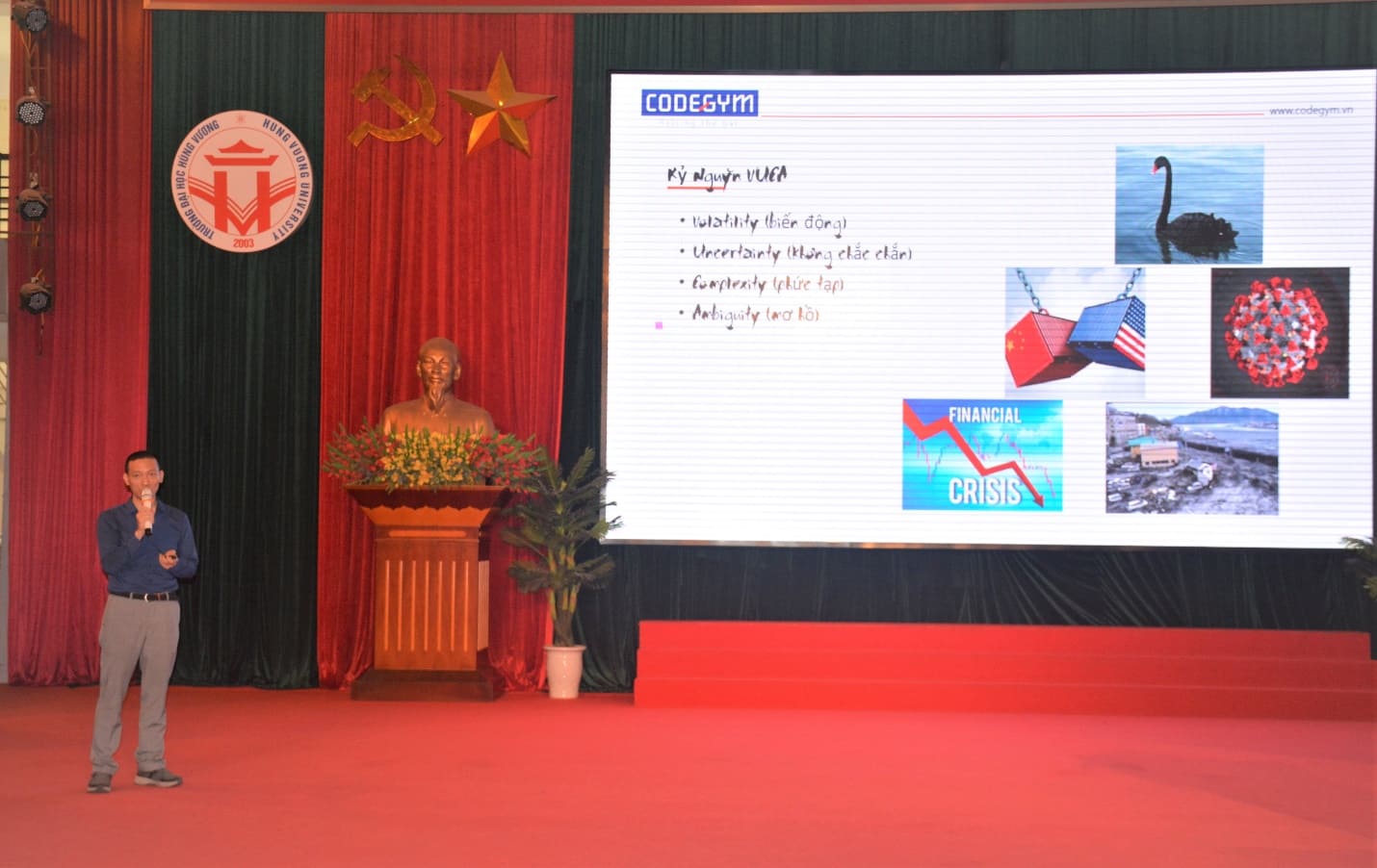 Nhằm giúp các sinh viên Đại học Hùng Vương (Việt Trì) nắm bắt nhu cầu về thị trường lao động và chuẩn bị những hành trang tri thức cần thiết trên con đường lập thân, lập nghiệp sau khi ra trường, sáng ngày 09/06/2020, trường ĐH Hùng Vương đã phối hợp với Hệ thống đào tạo lập trình hiện đại CodeGym tổ chức Hội thảo “Lộ trình nghề nghiệp và cơ hội việc làm cho sinh viên”.