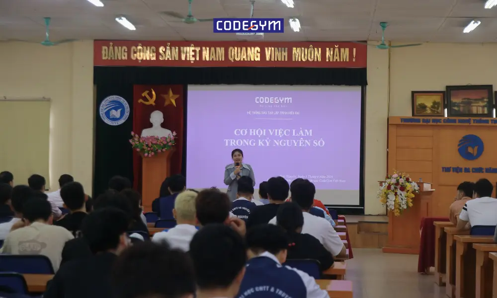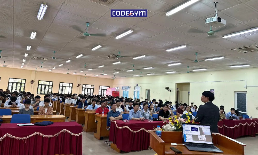 Ngoài ra, buổi lễ còn có chia sẻ tâm huyết từ diễn giả Lê Thị Châu – Giám đốc Đào tạo CodeGym Việt Nam. Với chủ đề “Xu hướng công nghệ và cơ hội việc làm trong kỷ nguyên số”. Mong rằng những kiến thức, góc nhìn từ người trong nghề mà chị Châu đem đến. Sẽ là hành trang bổ ích, giá trị cho các bạn sinh viên trên con đường chinh phục đam mê công nghệ thông tin.