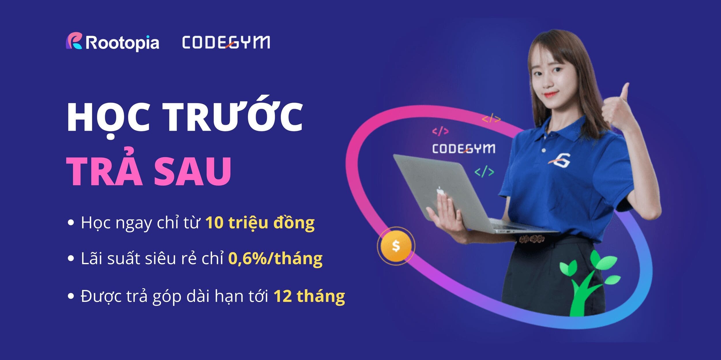 Đồng hành cùng nhiều học viên trong những năm qua, CodeGym biết rằng: Không ít bạn đã chùn bước trên chặng đường khởi đầu sự nghiệp vì rào cản tài chính, dù có nỗ lực và quyết tâm cao độ. Với mong muốn san sẻ gánh nặng này, CodeGym tin tưởng hợp tác cùng Rootopia đưa ra Chương trình bảo trợ học phí.