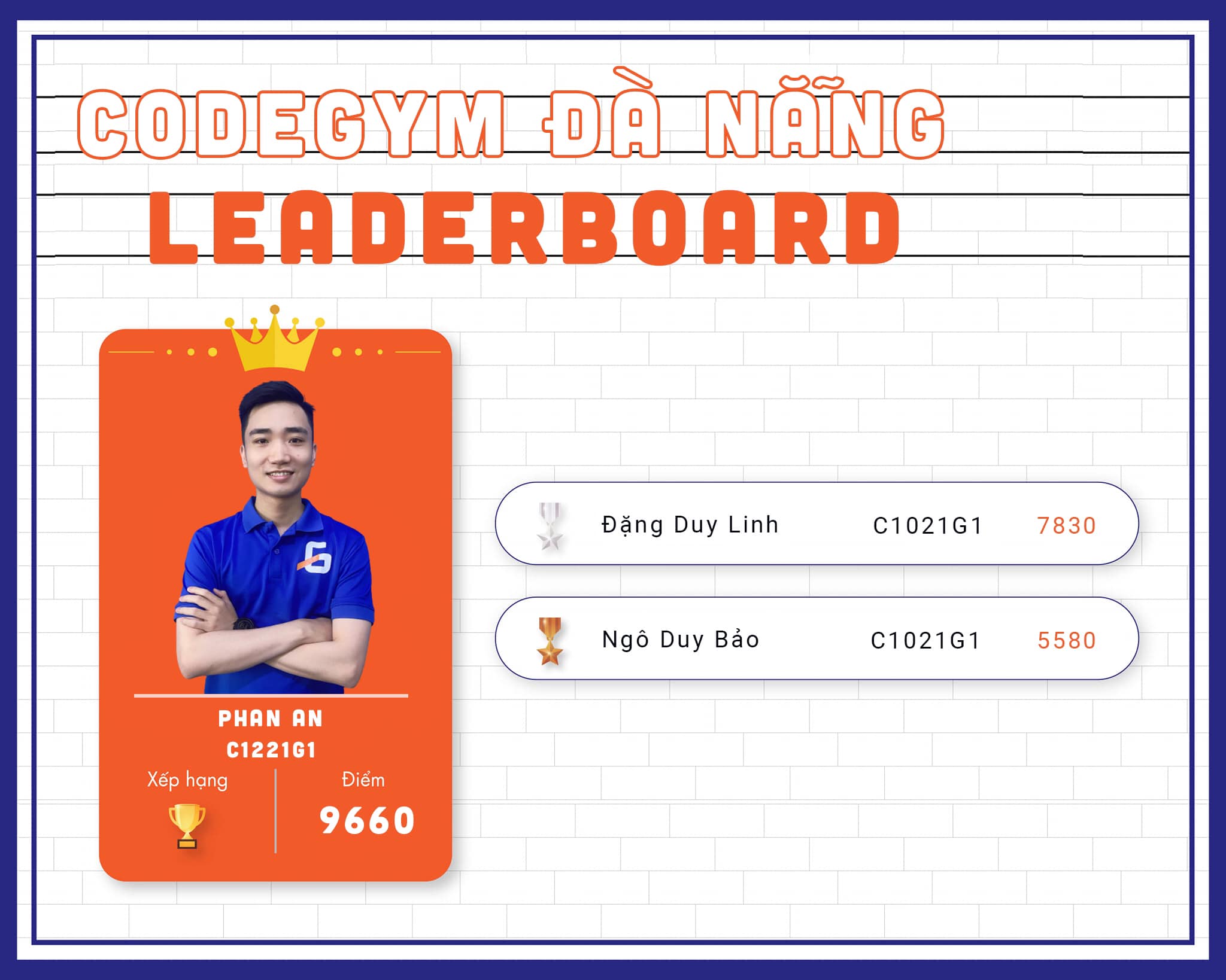 CodeGym leaderboard là bảng xếp hạng thi đua thành tích của học viên tại CodeGym theo tuần, theo tháng. “Bảng vinh danh” sẽ thay đổi từng giờ, từng ngày dựa theo sự cố gắng của từng học viên. Số điểm mà mỗi học viên nhận được sẽ dựa trên kết quả hoạt động hàng ngày tại CodeGym. Leaderboard sẽ được cập nhật liên tục trên trang CodeGym SIS (https://andy.codegym.vn/leaderboard).