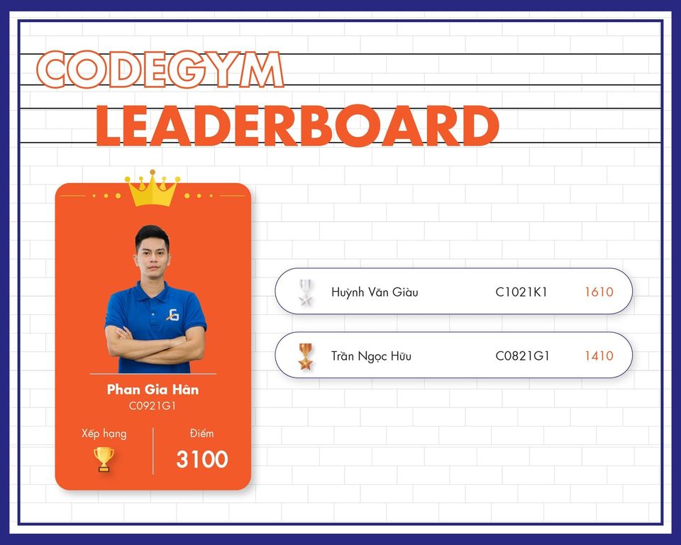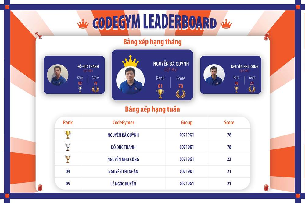 Đây là những gương mặt xuất sắc nhất vượt lên trên tất cả để góp mặt trong danh sách LeaderBoard tại các chi nhánh. Sự cố gắng trong phong trào học tập tại CodeGym của các bạn luôn được ghi nhận.