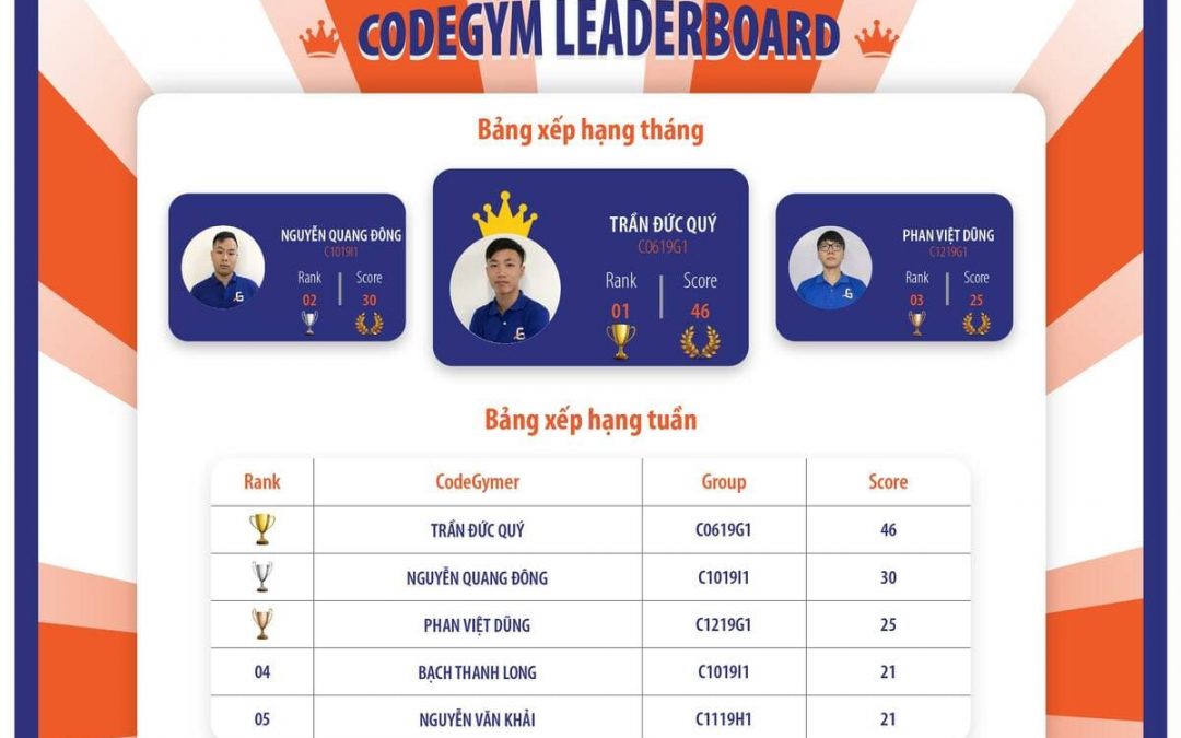 Sau 1 tháng dài chạy đua không ngừng nghỉ với bài vở, với code, với bug, những nỗ lực của các bạn học viên đã ghi được dấu ấn tại CodeGym Leaderboard – nơi được mệnh danh là bức tường danh vọng tại CodeGym.