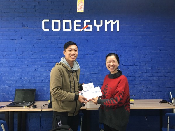 Ngày 10/02/2020, chị Vũ Thị Kiều Anh – Huấn luyện viên, giảng viên đã thay mặt bộ phận đào tạo tuyên dương, động viên và gửi tặng bạn Trần Đức Quý món quà ý nghĩa từ CodeGym.