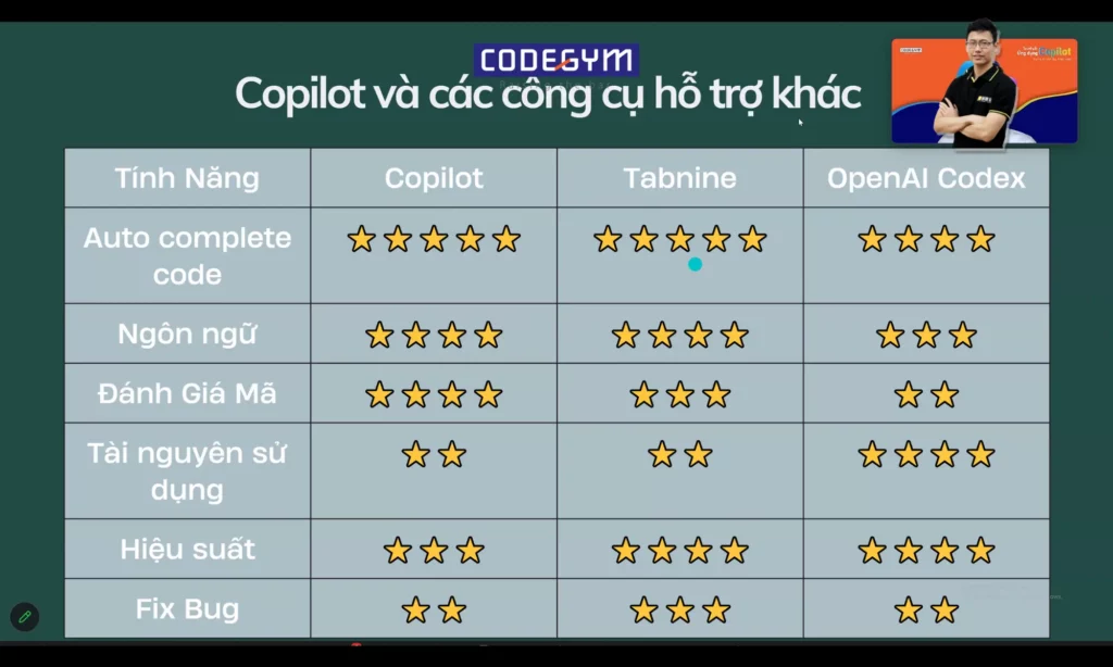 Tối ngày 11/04, CodeGym đã tổ chức thành công Techtalk: Ứng dụng Copilot – Trợ lý AI cho lập trình viên” qua nền tảng Zoom. Phiên chia sẻ diễn ra trong 2 giờ. Với sự tham gia của diễn giả Phan Văn Khôi cùng các học viên, cựu học viên CodeGym, các lập trình viên có mong muốn tìm hiểu về AI.