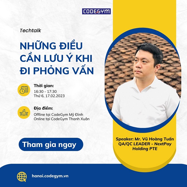 Tất cả những thắc mắc của bạn sẽ được giải đáp trong techtalk: “Những điều cần lưu ý khi tham gia một phiên phỏng vấn” với sự chia sẻ của diễn giả: Mr. Vũ Hoàng Tuấn – QA/QC Leader tại NextPay Holding PTE.
